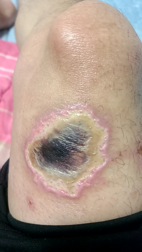 화상 주변의 피부에서 보이는 붉은 정도가 더욱 늘어나는 것이 아니라면 염증이 악화된 것은 아닙니다. 중심부의 검고 노란 부분은 가피가 형성된 것인데, 다리가 붓거나 압박되는 느낌이 없다면 괜찮습니다.