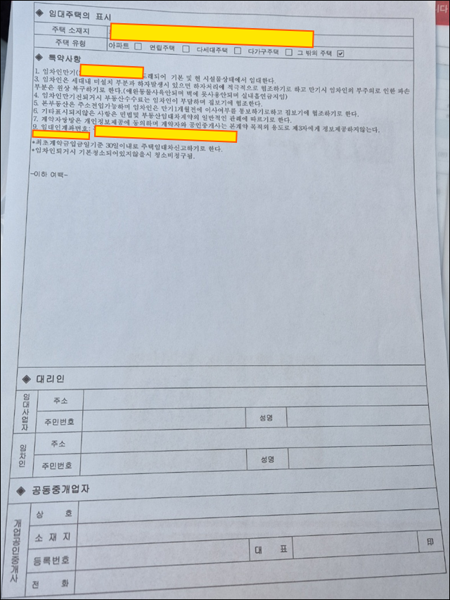 2020년도 개정된 법에 따르면 만기 2개월 전 이사 통보하여야 하나, 1개월 전 통보로 기재 되어 있습니다. 법적으로 오류가 있는 계약서에 정보 및 날인이 없는 특별 조항이 효력이 있을까요? => 당사자 날인 없는 계약서는 효력이 인정되기 어려울 뿐만 아니라 애초 퇴실시기를 쌍방 협의하여 결정한 것이기 때문에 이를 중도퇴실로 볼 수도 없습니다.