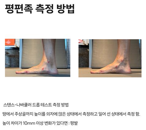 사진으로 보아서는 정확히 알 수가 없으며 평발을 확인해 보기 위해서는 정형외과에서 x-ray 검사를 통하여 종골과 제1중곡골 사이를 긋고, 종골과 거골을 일직선으로 그었을 때 각도를 측정하여 알아 보는 방법이 가장 정확하며 의자에 앉았을 때와 서 있을 때 지면에서 주상골 까지의 높이를 측정하여 아치가 무너졌는지 확인하는 방법이 있습니다.