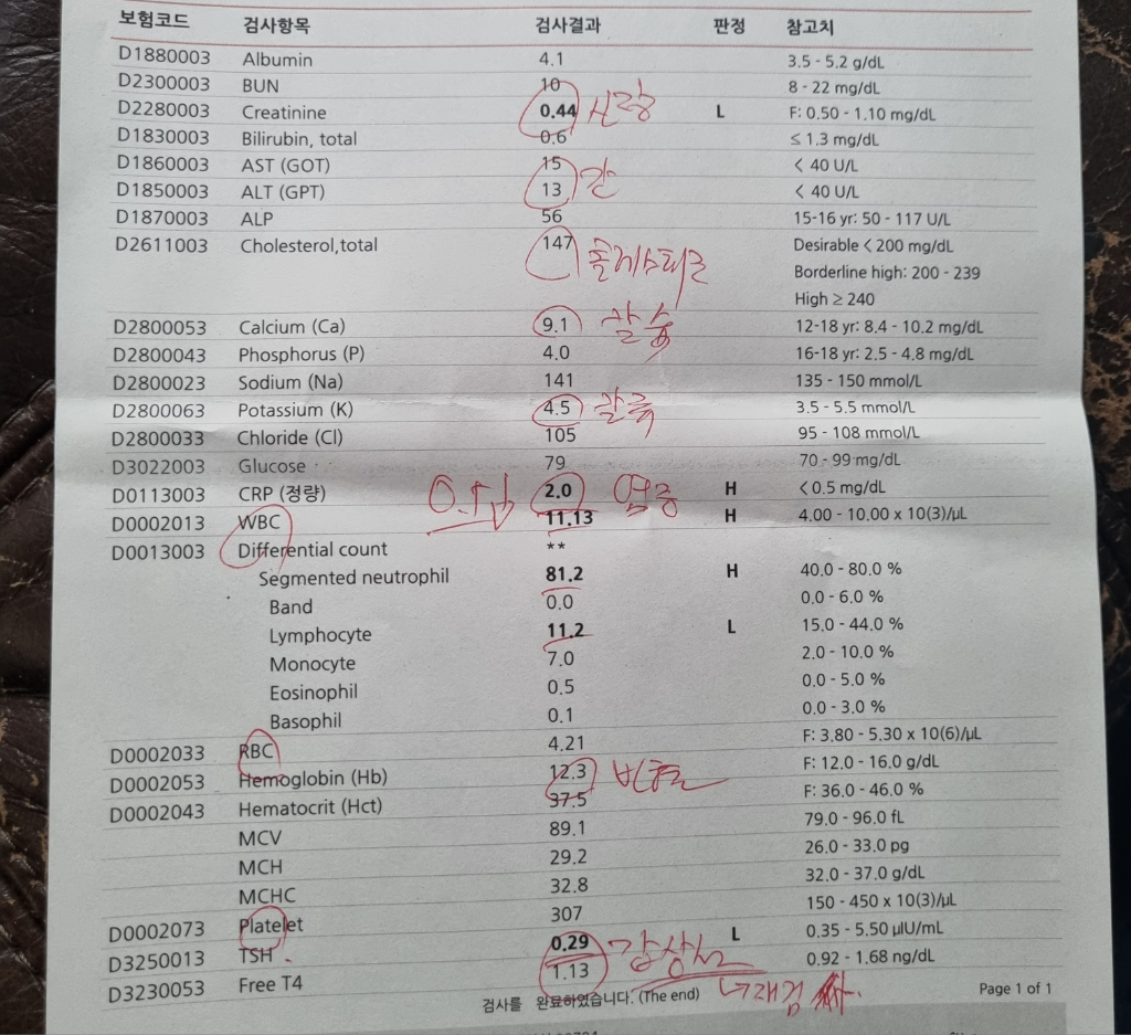 결과 염증 수치 높고 갑사선 수치가 낮습니다
