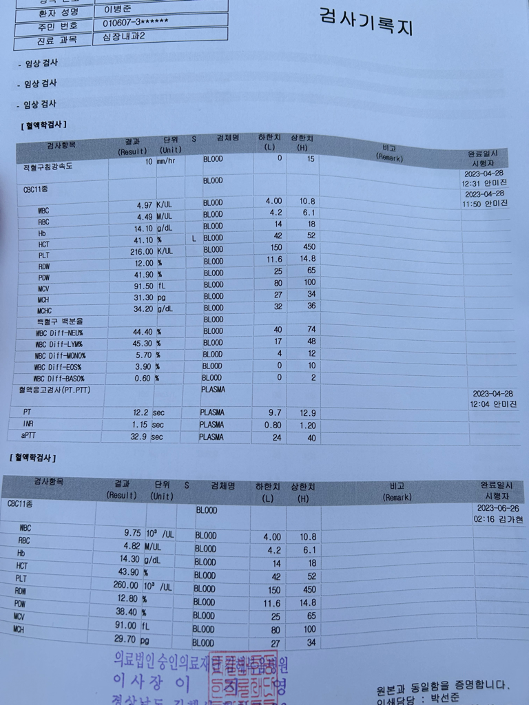 6월26일에 응급실에서 검사한 심전도,엑스레이,피검사,응급피검사 정상 이였습니다