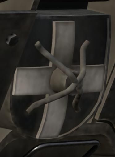 하얀색 십자가 모양에 x자 막대기로 덮여 있는 구조물은 견인장치일거에요. 전차가 고장 나거나 이동이 어려울때, 다른 차량이 케이블이나 봉을 연결해 끌 수 있도록 마련된 장치일것이고, 십자모양은 케이블이나 견인봉을 안정적으로 고정할 수 있도록 금속 구조물이 십자 형태로 배치된 걸거에요. 사용하지 않을때는 이 장치가 외부 충격이나 먼지로 손상되지 않도록 덮개나 보호용 막대가 교차 형태로 씌어져있고, 전차 후미 중앙에 있는 이유는 전차를 뒤에서 끌어내는 상황이 가장 많기 때문일거에요. 기계적 실용 장치이지 특별한 전술적 표식은 아닐거라고 봐요.