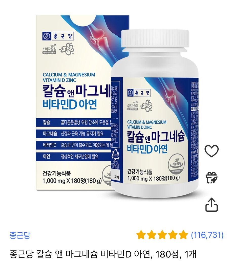 아래 종근당 제품은 비타민D를 보충하기 위한 목적 보다는, 칼슘과 마그네슘을 섭취하는 것이 주된 목적입니다