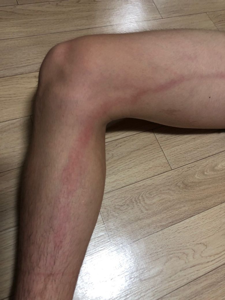 안녕하세요 22살 남자입니다 제가 오래 무리해서 서있으면 다리가 사진과 같이 혈관쪽이 붉은색을 띄면서 멍든것처럼 아팠습니다 그러다 다시 원래 다리처럼 돌아오고는 하는데 이런 일이 총 여태 3번가량 있었고