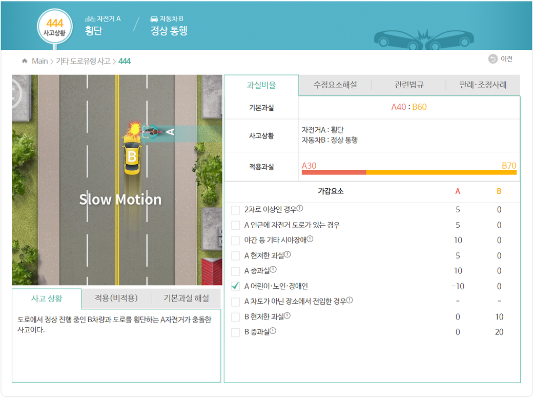 과실비율정보포털에서는 횡단보도 없는곳을 자전거가 무단횡단시에도 기본 4:6 노인의경우 3:7 나오는것 같은데요.