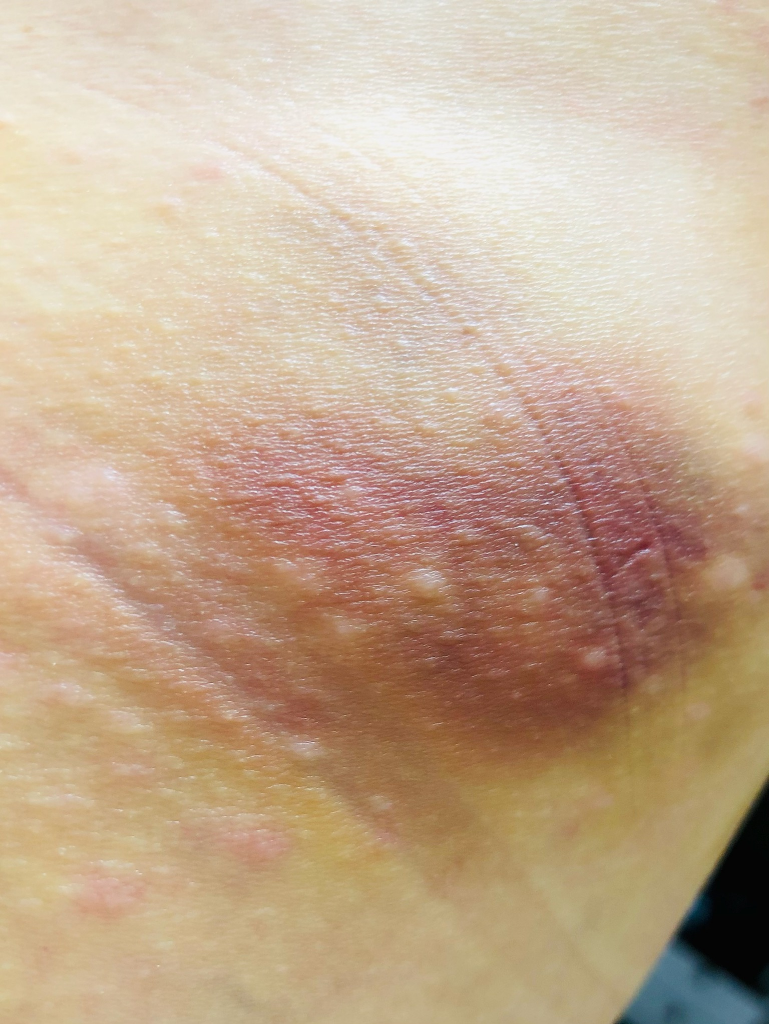 두드러기가 생긴 부위에는 스테로이드 성분의 크림을 발라주시고 멍은 시간이 지나면서 빠질테니 걱정마세요.