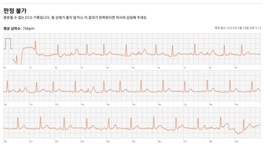 스마트워치의 심전도 기능 및 소견을 통해서는 알 수 있는 정보가 많지 않습니다. 심전도는 12 유도 심전도를 보아야 정밀하게 평가가 가능하며 몸 여기저기 전극을 부착하여서 검사를 하는 것이 아니라 단순히 손목 한 곳에서 측정한 정보로는 진단적 가치가 떨어집니다.