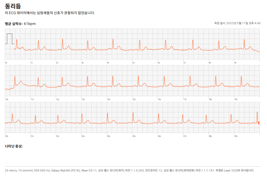 위와 같은 증상이 있을 때 갤럭시 워치 4를 통해 ECG 측정을 해보았을 경우 다음과 같은 측정 값이 나옵니다.