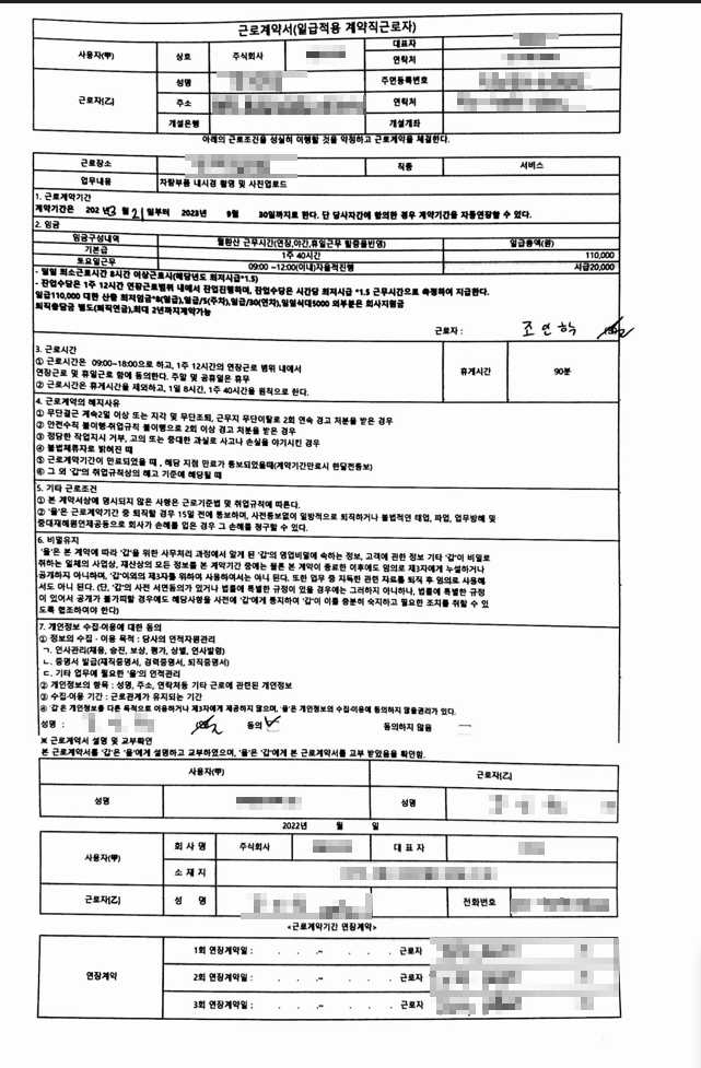 아래는 근로계약서 명시 내용입니다.