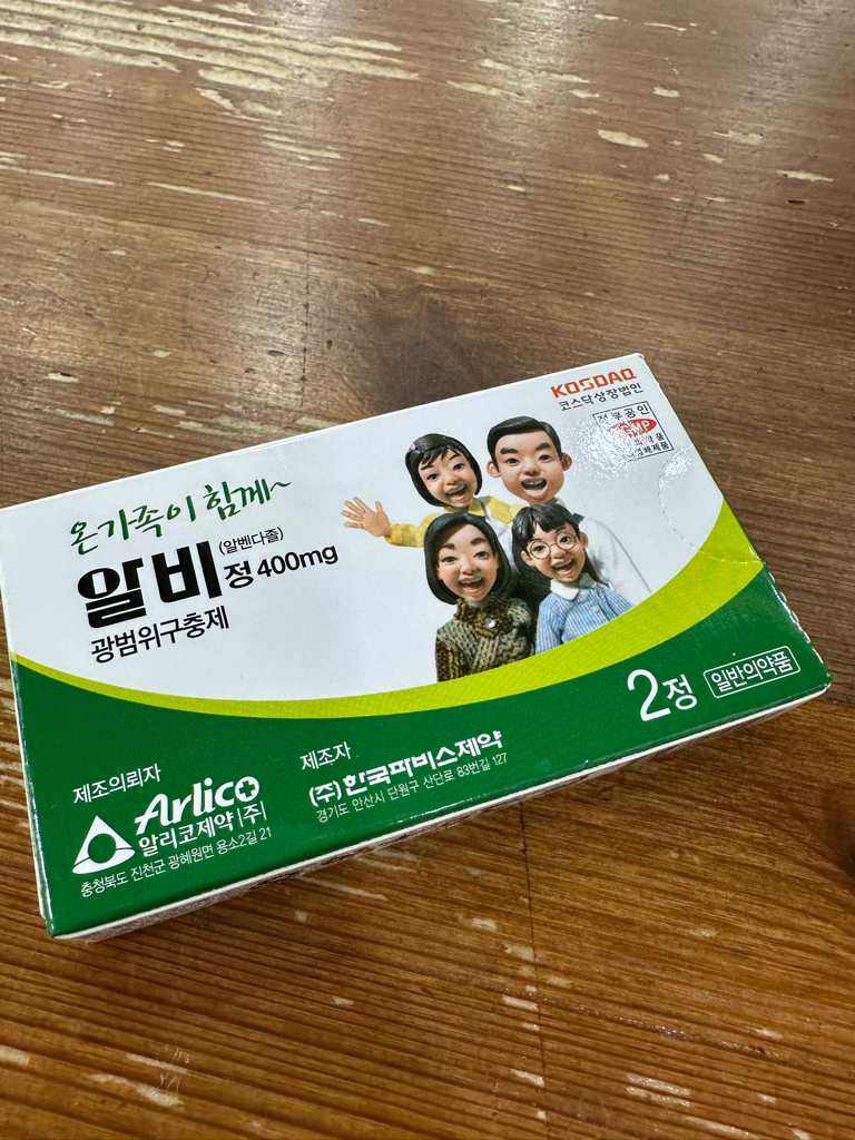 편한 시간에 복용하시면 되며, 알벤다졸 성분이기 때문에 1주일 뒤에 남아있는 1알을 마저 챙겨드시는 것만 신경쓰시면 됩니다