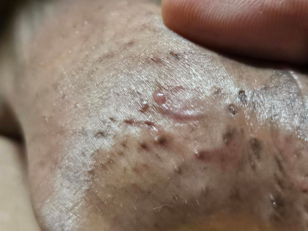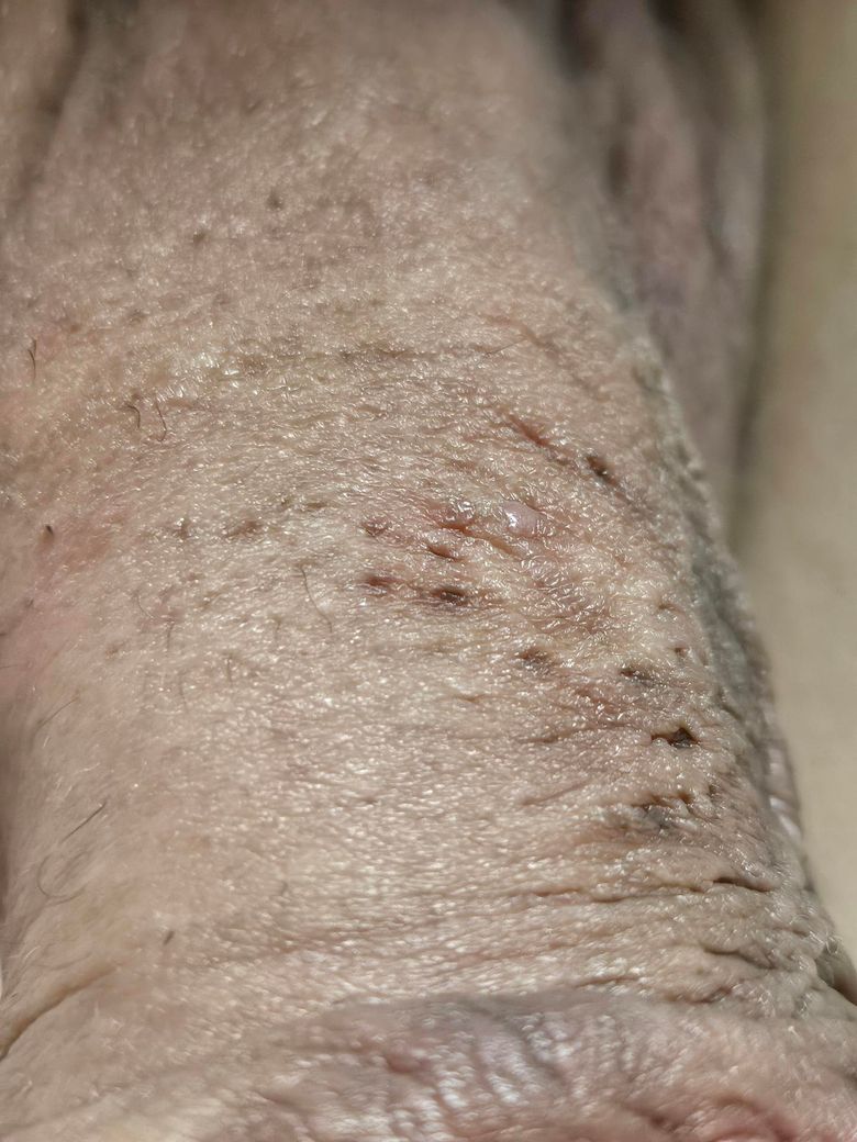 사진상 병변은 전형적인 곤지름 형태로 보이진 않습니다. 곤지름은 보통 표면이 울퉁불퉁한 사마귀 모양, 꽃양배추처럼 군집된 형태, 피부색 또는 회색빛으로 돌출되는 양상이 흔합니다. 현재 사진은 작은 구진과 색소침착, 일부는 모낭 중심으로 보이는 병변이 섞여 있어 모낭염이나 면도/마찰 관련 변화 가능성이 더 우선입니다.