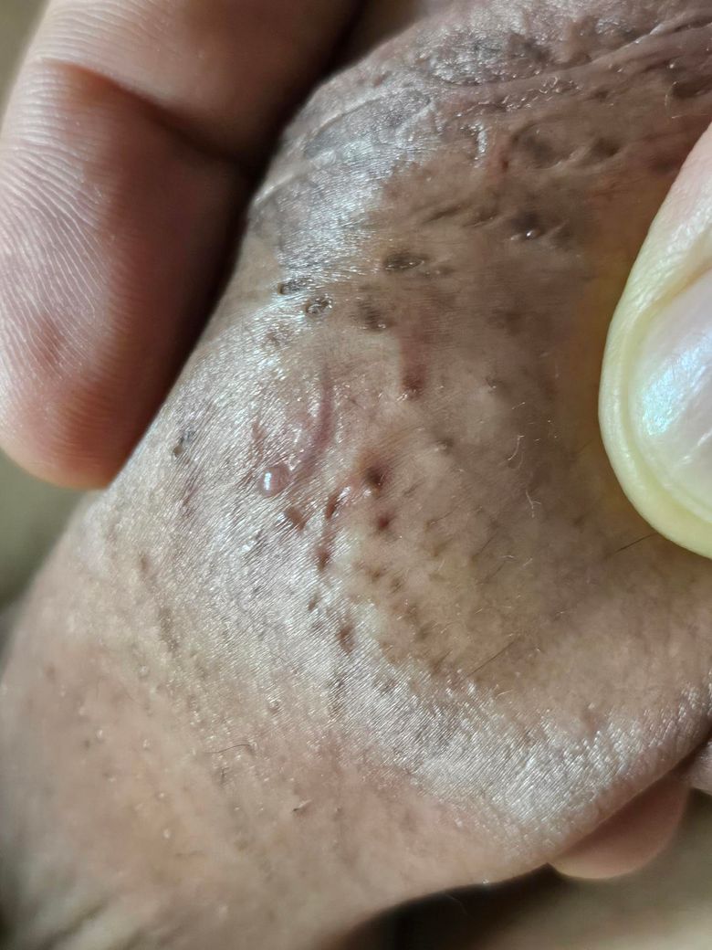 보기 싫어서 그렇지, 곤지름일 가능성은 낮아보입니닻. 색소침착이 동반된 모낭염 가능성이 더 커보입니다.