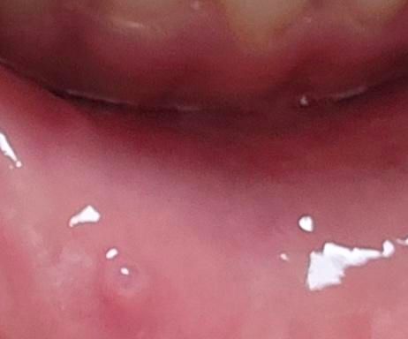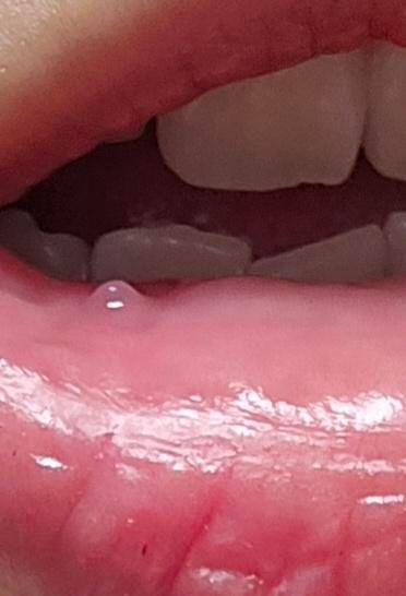 꽉 씹지 않았더라도, 삼각김밥 같은 음식을 먹다가 미세하게 점막에 자극이 가거나, 침샘의 구멍이 이물질로 막히면서 발생할 수 있으며 대부분 통증은 없고, 혀로 만졌을 때 약간 단단하고 매끈한 공 모양으로 느껴지며, 사진처럼 속이 비쳐 보이는 파르스름하거나 맑은 물혹 형태를 띱니다.