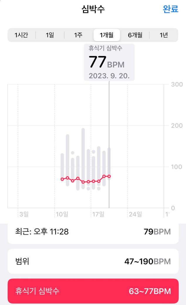 약 일주일 동안 휴식기 심박수는 63~73가 나왔어요.