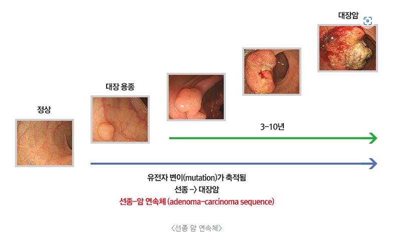 선종이 암으로 발전하는 데는 평균적으로 7~10년 정도 걸릴 수 있다는 연구 결과도 있습니다. 즉, 선종이 반드시 암으로 변하는 것은 아니지만, 그 가능성은 상당히 크기 때문에 적극적인 관리가 필요합니다.