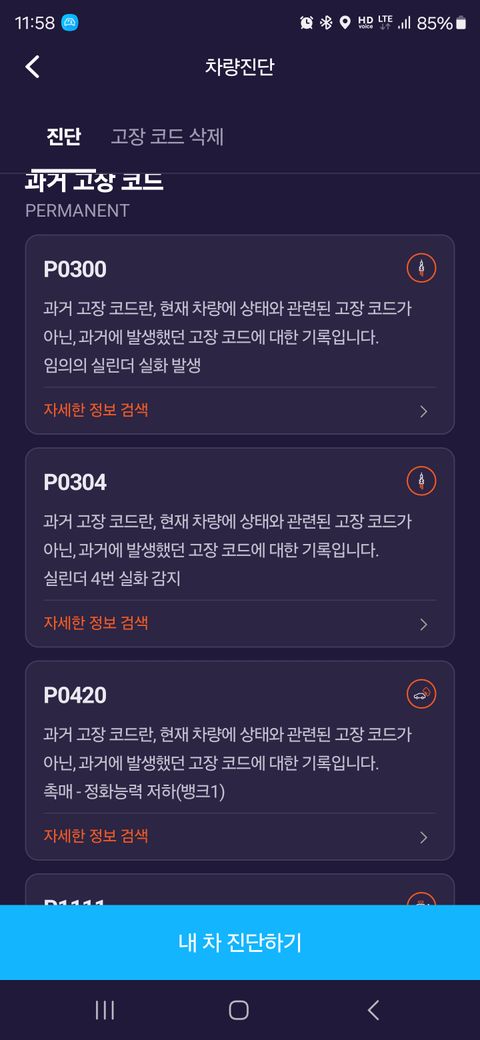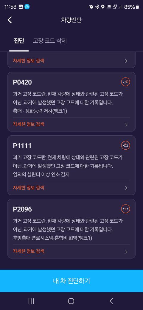 진단결과가 나왔는데 과거고장코드내역에 여러 코드들이 나오는데 삭제 가능할까요?
