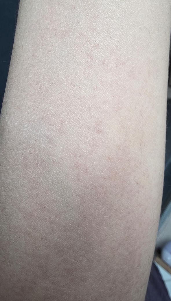 사진상 병변은 자반증보다는 샤워 후 일시적 혈관 확장이나 모공 주변 홍반(경미한 피부 자극 또는 건조 피부 반응) 양상에 더 가깝습니다. 점들이 매우 작고 균일하며 보라색 출혈반 형태가 아니고, 이전에도 보습 후 자연 소실된 점을 고려하면 실제 피부 출혈성 병변 가능성은 낮아 보입니다.