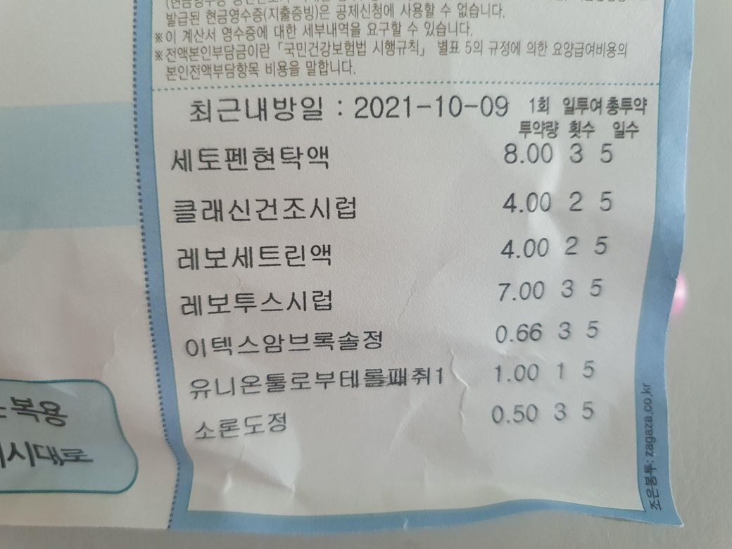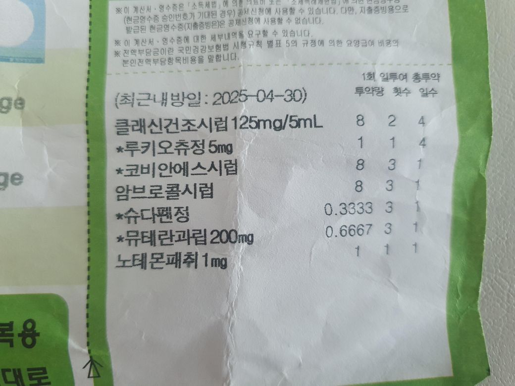 와서 보니 같은 같은 클래신건조시럽을 처방해 주셨는데 기존엔 1회 8cc였는데 지금 받은 약은 4cc로 되어있어요. 크게 바뀐 건 이번에 소론도정이 추가되었어요.