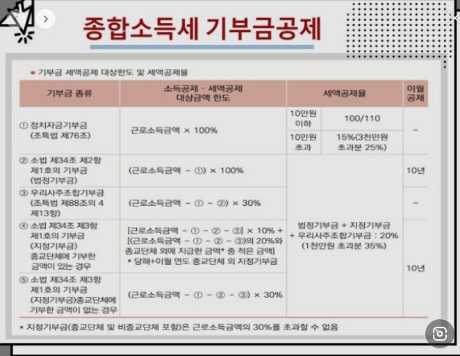즉, 기부금 세액공제란 당해 과세기간에 개인인 근로자가 국가, 지방자치단체, 학교, 사회복지법임 등에 기부금을 지출시에 근로소득 연말정산시의 근로소득세 산출세액에서 일정액을 기부금 세액공제를 적용하여 기부 문화 지원 및 근로자의 근로소득세 부담을 줄여주는 세액공제 제도입니다.
