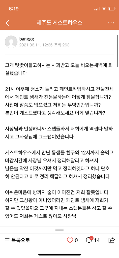 숙박시설이용후 네이버 카페에 글을 작성하였습니다