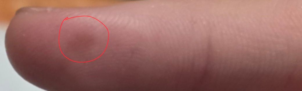 사진을 기준으로 보면, 병변은 손가락 끝 패드 부위에 위치한 옅은 갈색 반점으로, 경계가 비교적 흐리고 표면의 각질 변화나 출혈, 궤양은 보이지 않습니다. 색도 매우 진하지 않고 검은색·회색·여러 색이 섞인 소견은 없어 보입니다.