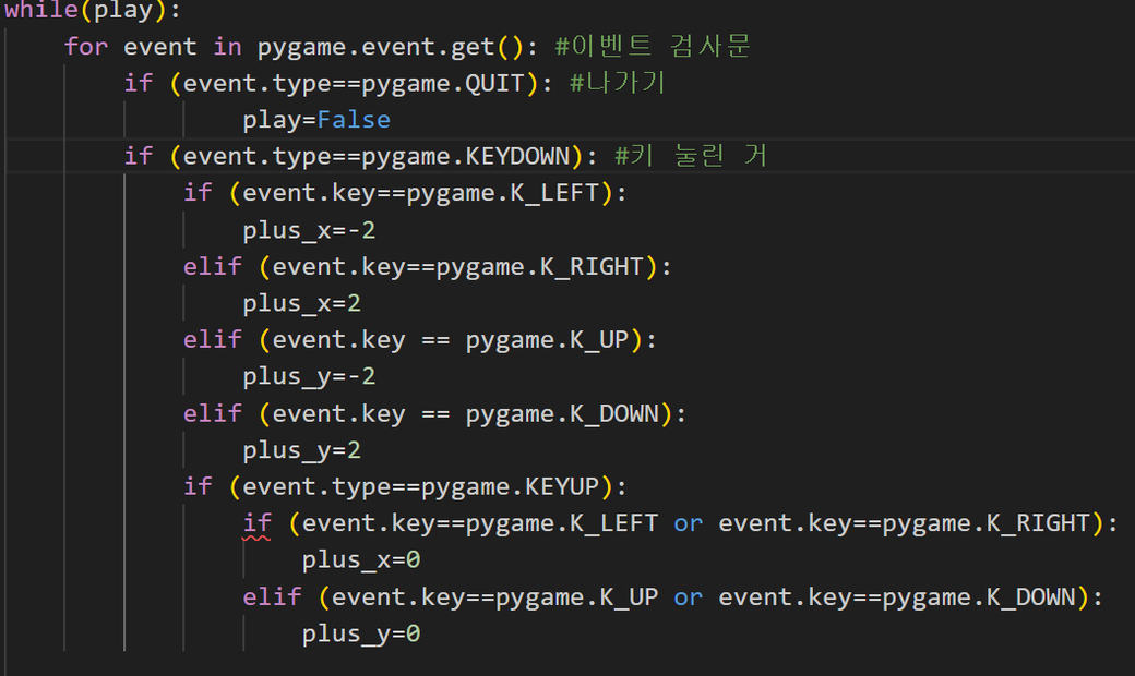 안녕하세요. 점잖은매미51입니다. event.type 구문과 event.key 구문을 혼동하신 게 아닐까 싶습니다. 빨간 줄이 있는 if 바로 위 if event.type...KEYUP 위치가 한 탭 덜 들여써서 위 if event.type...KEYDOWN과 같게 위치해야 할 것 같습니다.