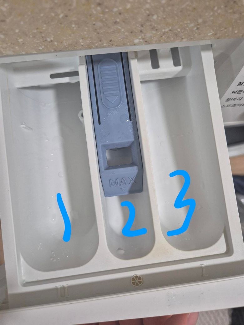 3번은 애벌세탁할 때 쓸 세제를 넣는 칸이고, 1번은 본세탁을 할 때 넣을 세제칸, 2번이 섬유유연제칸이예요. 지금까지 세제로 후딱 애벌빨래만 하시고, 섬유유연제 넣고 세탁 후 맹물로 헹굼하신거예요. 세제와 섬유유연제 순서는 바뀐게 아니라 다행이네요ㅎㅎ