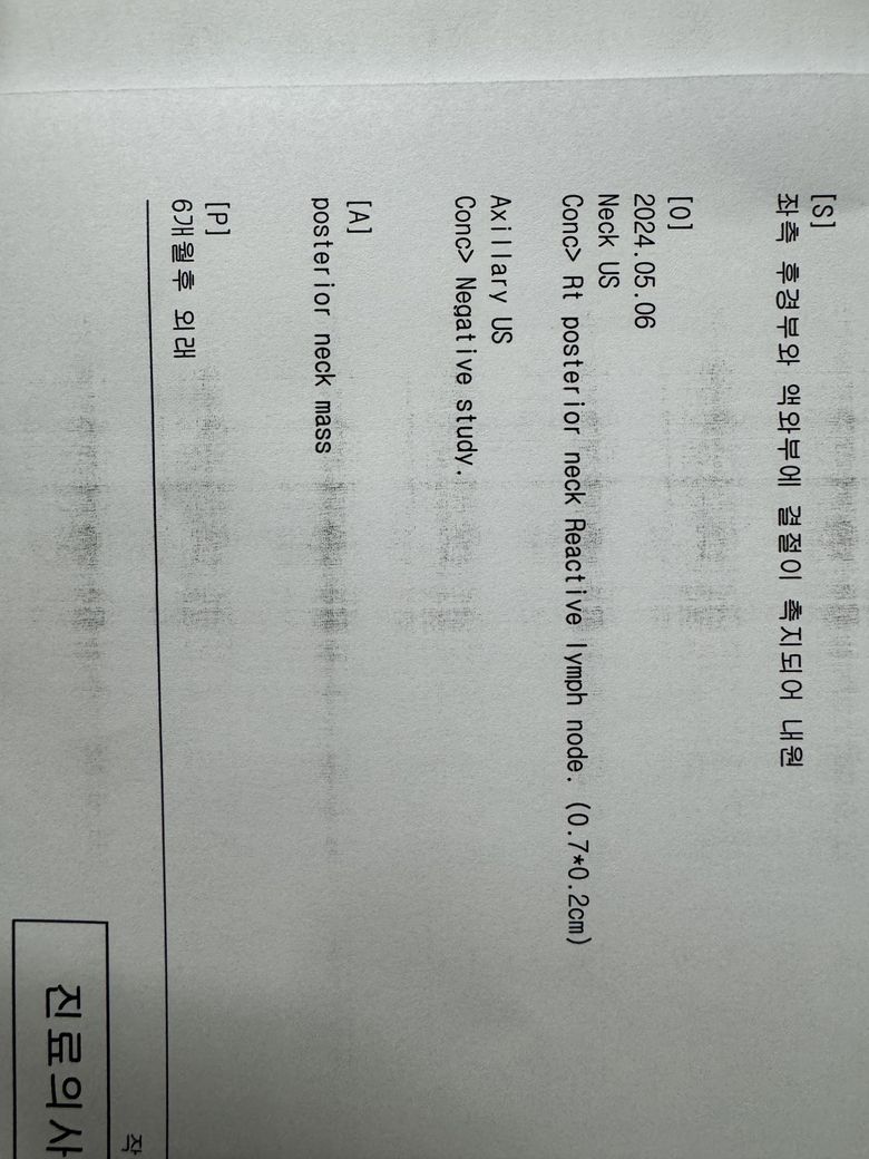 검사 결과 염증 등에 의해서 임파선이 약간 커져 있는 정도라고 판독되었네요. 겨드랑이는 정상이구요. 그렇다면 그냥 지켜 보셔도 됩니다. 염증이 가라앉으면(보통 감기 거든요) 저절로 임파선은 작아질 겁니다.