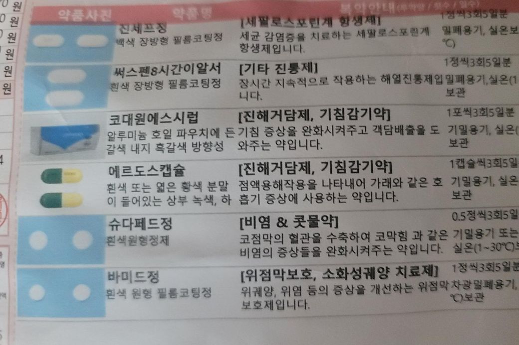 현재 복용중인 약은 진세프정(항생제), 써스펜8시간이알서방정(해열진통제), 코대원에스시럽(진해거담제),