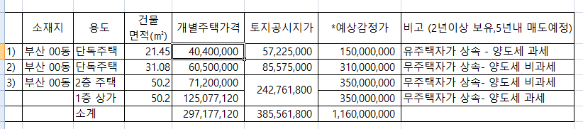 즉 1)번은 감정가 2)번은 개별주택가격 3)번중 2층 주택은 개별주택가격 1층 상가는 감정가로 선택하여