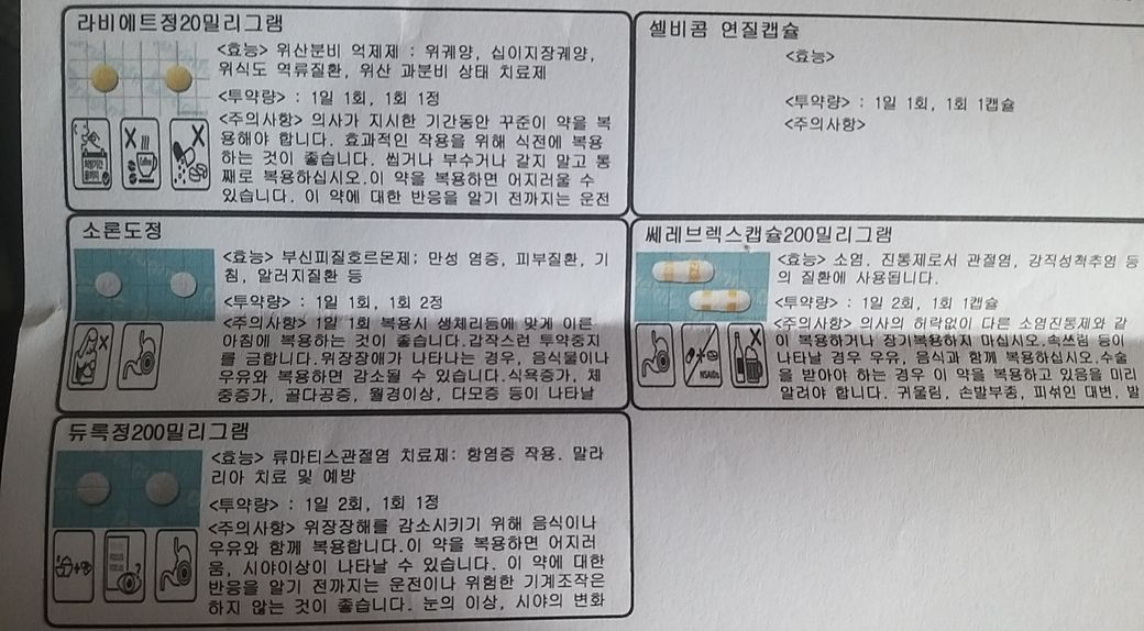 안녕하세요. 현재 루푸스 의심으로 첫번째 사진의 약을 복용하고 있습니다. 그런데 오늘 사랑니를 발치해서 두번째 사진의 약들을 처방받았는데, 같이 먹으면 안 되거나 중복된다 하는 약이 있을까요?