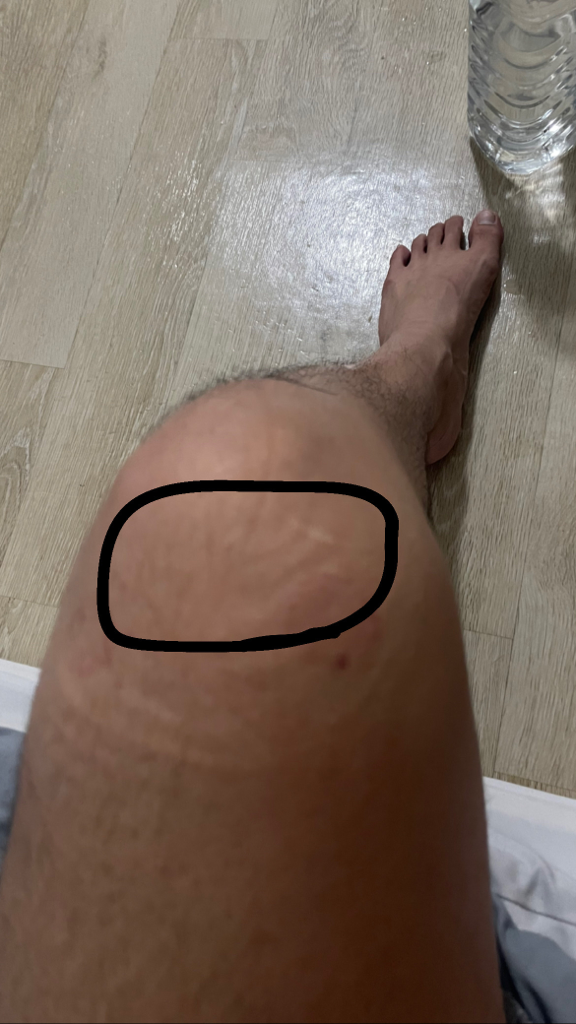 일단은 타박상으로 인한 증상으로 여겨집니다. 표시하신 부분은 무릎뼈 위쪽으로 연골, 힘줄이 있습니다. 휴식 및 냉찜질, 소염진통제를 복용하면서 경과를 보시고 증상이 호전되지 않는다면 정형외과에서 진료를 보시기 바랍니다.