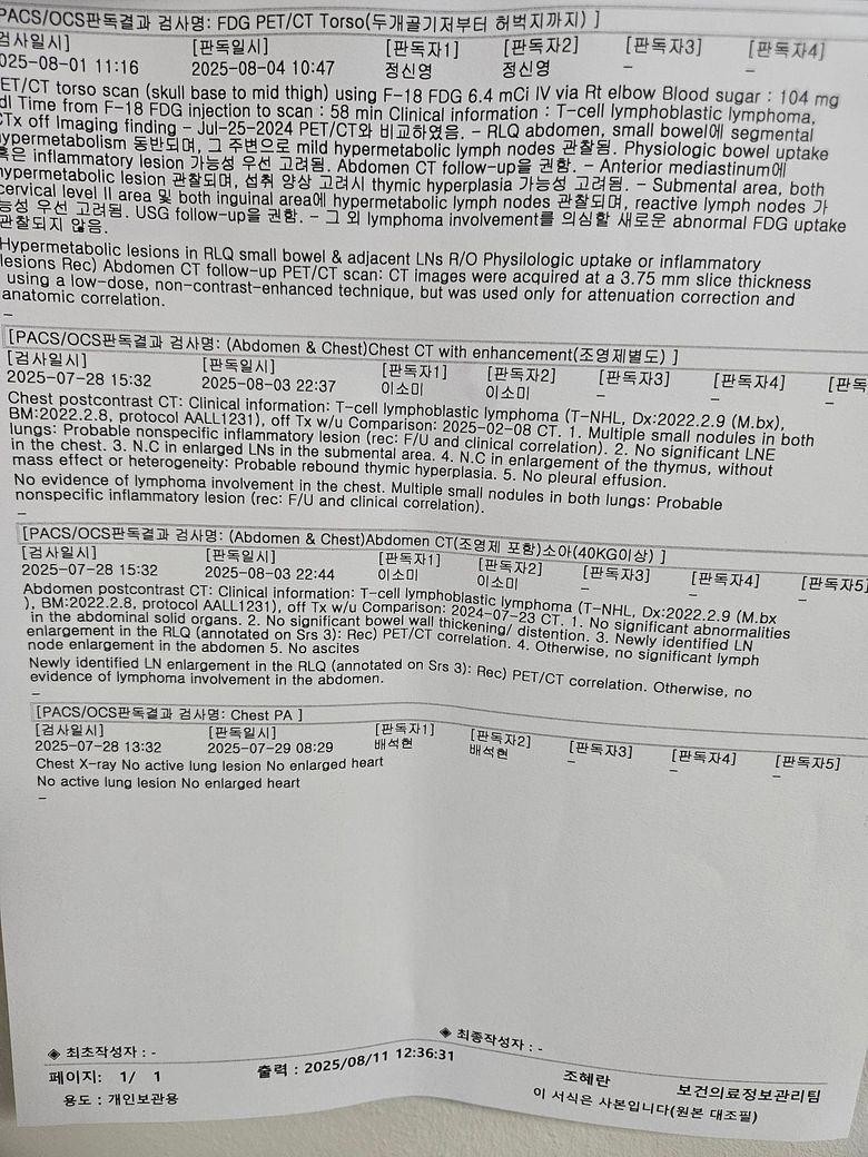 T세포 림프모구성 림프종. 치료종결후 중간검사 판독입니다.
