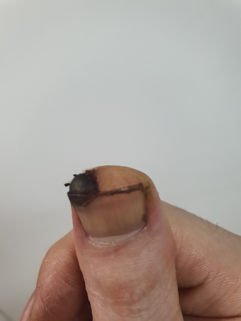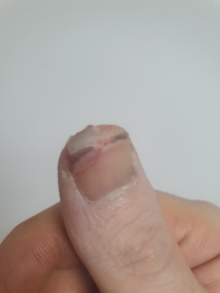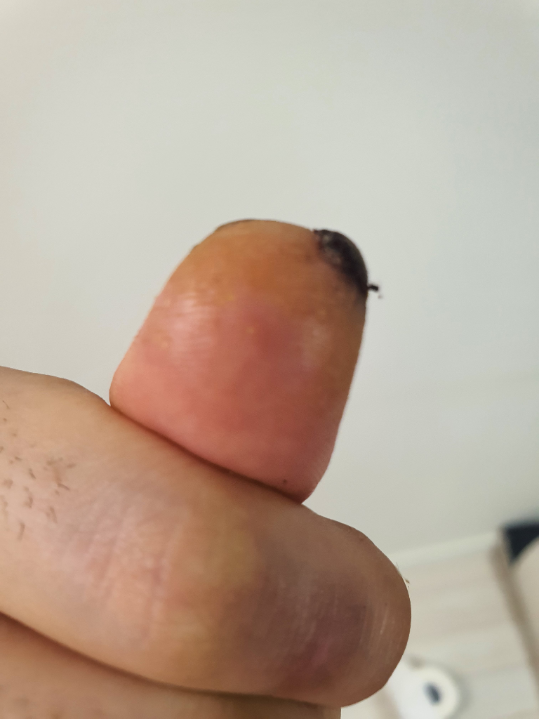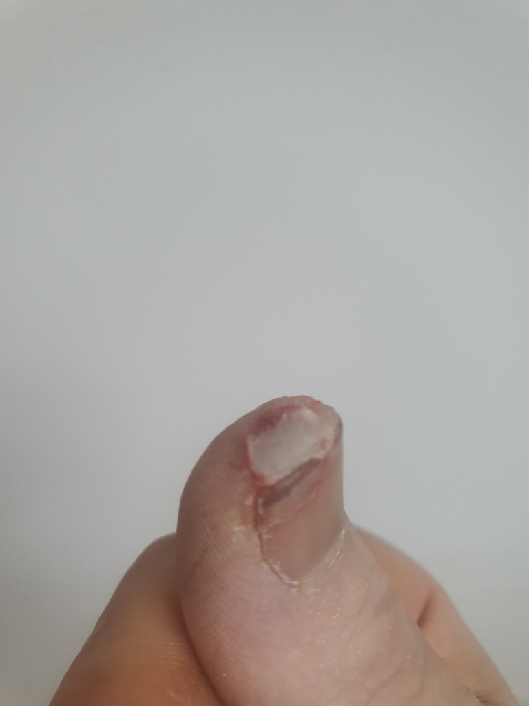 칼에 베여서 떨어져 나간 부위에는 혈류가 원활하게 이뤄지지 않으며 그로 인해서 사진 속의 소견과 같이 검게 변하며 조직이 죽을 수 있습니다. 부딪힌 것이 부정적인 영향을 주었을 가능성이 있습니다. 그렇더라도 그 아래 쪽의 조직을 보호하기 위해서는 덮어 놓는 것이 바람직하며, 되도록이면 혼자 관리하기 보다는 병원에 다니시며 관리받으시길 권고드립니다.