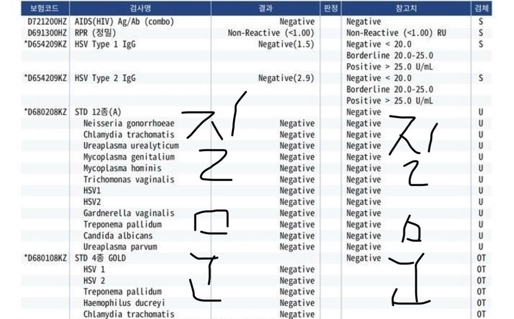 검사 결과부터 보면 성병 가능성은 매우 낮습니다. 첨부하신 검사표에서 HIV, 매독(Treponema pallidum), 임질(Neisseria gonorrhoeae), 클라미디아(Chlamydia trachomatis), 마이코플라즈마, 유레아플라즈마, 트리코모나스, 헤르페스 1형·2형 모두 음성입니다. 현재 시행된 STD 패널 기준으로 주요 성매개감염은 확인되지 않습니다.