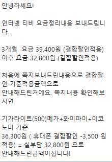 월 말쯤 TV+인터넷 월 요금 32,400원에 진행하기로 계약 했는데