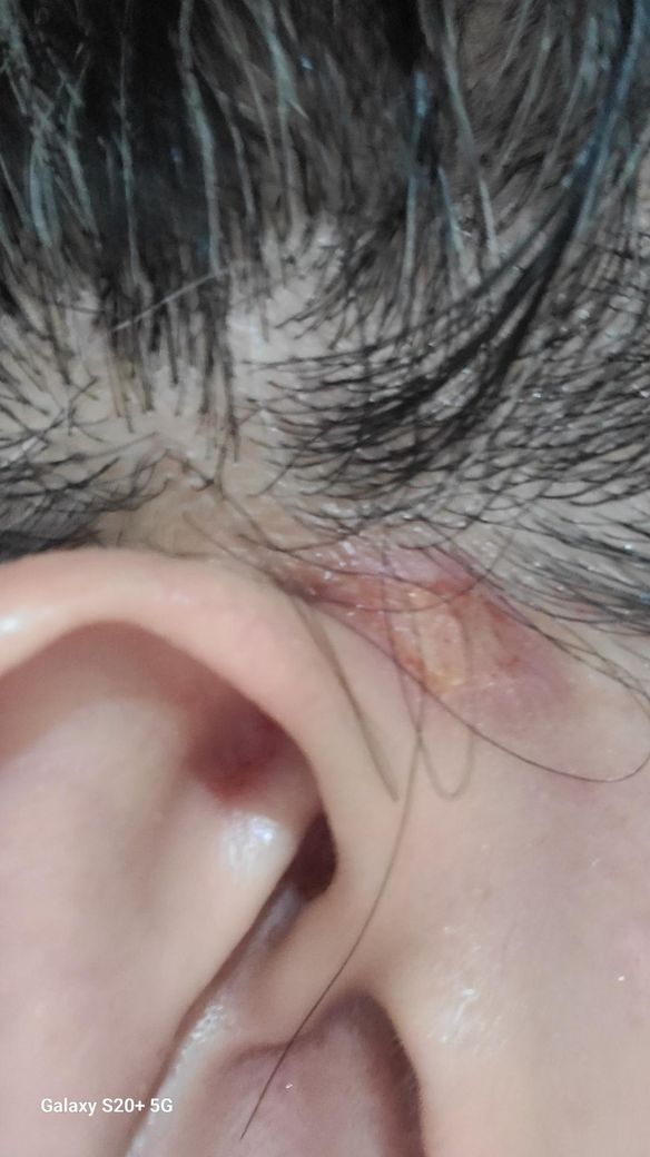 두피 모낭염 또는 초기 종기. 귀 뒤·두피에 흔하고, 세균성 염증으로 붉은 구진이나 작은 결절 형태로 나타나며 압통·작열감이 동반됩니다. 초기에는 고름이 거의 없고 피만 나올 수 있습니다.