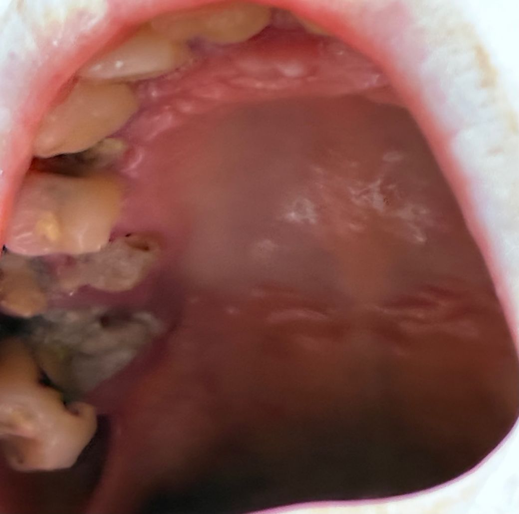 구강 위생 불량인지 크기가 다소 큰 궤양성의 병소인지