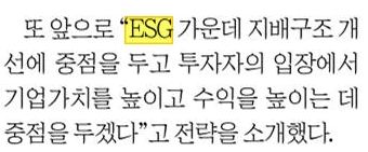 위 기사는 지배구조 관련 내용으로 보입니다. ESG는 기존 기업의 사회적 기여, 지배구조 개선 및 환경 보호 등을 모두 연계하여 회사의 지속가능성 크기로 판단하게 되었고 2020년초 세계 최대 펀드 회사인 블랙록의 래리 핑크 회장이 ESG에 부합하지 않는 회사는 투자를 회수하거나 신규 투자를 하지 않겠다는 선언을 하면서 하나의 글로벌 트렌드가 되었습니다.