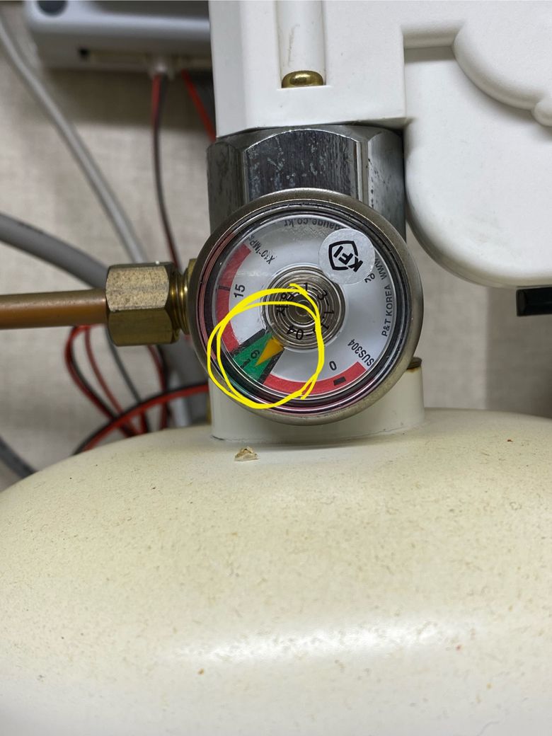 • 주의 사항: 하지만 바늘이 녹색 왼쪽(노란색/흰색)으로 치우치기 시작하면 압력이 빠진 것이니 그때는 바로 교체하셔야 합니다.