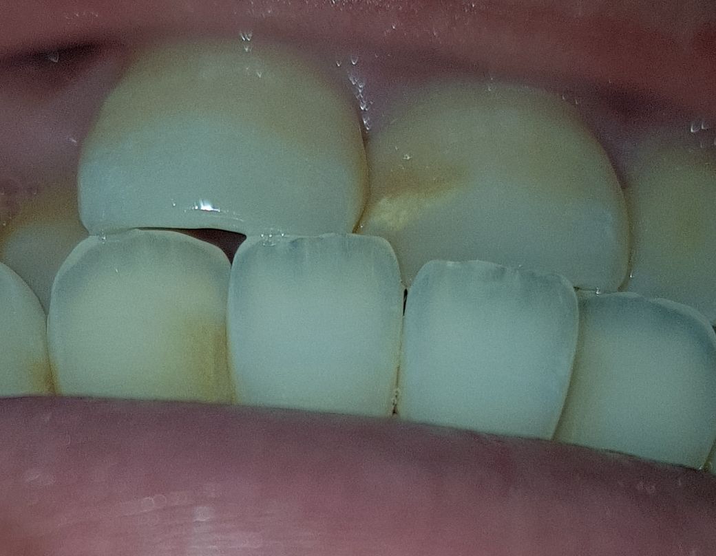사진상으로는 크게 충치가 잇어 보이진 않지만, 위 앞이 바깥쪽은 치아가 선천적으로 약하게 태어난거 같으니 관리를 잘해주시는게 좋을것같습니다.