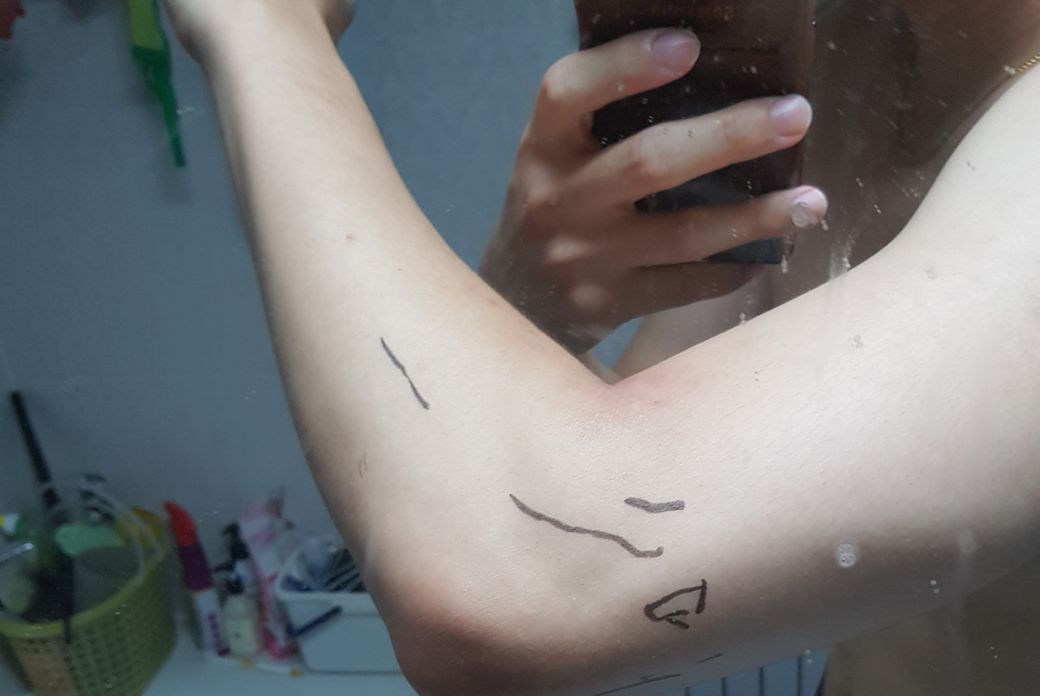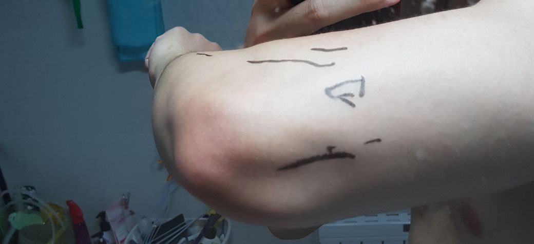 증상만으로는 팔꿈치 손상 여부를 알수 없습니다. 다만 표시한 부분은 외측의 폄근들의 힘줄 및 삼두 힘줄, 상완근 힘줄 주변으로 보이며 근육의 과긴장 및 힘줄의 타이트한 정도는 있을수 있겠습니다.