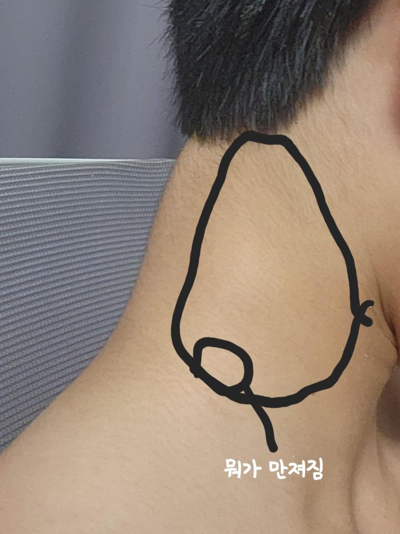 친구한테 숨이 아쉬어질정도에 초크를 당했는데 그 후로 목 옆쪽에 멍울같은게 잡히고 왼쪽 목 옆쪽이 땡땡해서 목을 움직일때마다 아프고 누군가 잡아당기는 느낌이나 아프고 불편합니다 도와주세요 아픈 부분은 사진에 자세히 그림으로 그려서 나타내었습니다 도와주세요 저 동그라미가 멍울같은게 잡히는 곳이고 라인 친곳이 부은것 처럼 땡땡한 부분입니다!