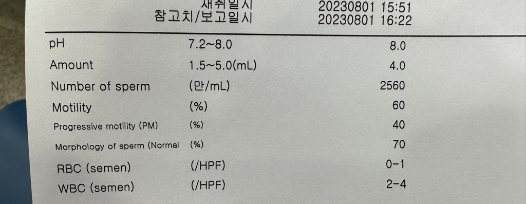 비뇨기과. 남자 산전 체액검사 결과지 해석 부탁드립니다.