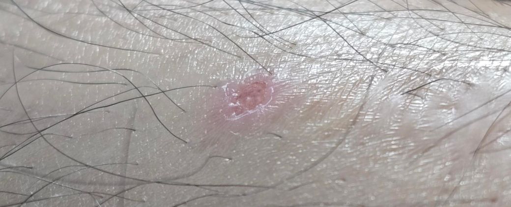 사진상 병변은 지름 약 3mm 정도의 표재성 찰과상으로 보이며, 중심부는 이미 연한 분홍색 육아조직이 형성되어 있고 주변에 얇은 막(재상피화 과정의 상피층 또는 얇은 가피)이 덮이기 시작한 단계로 판단됩니다. 출혈이 지속되거나 진물이 흐르는 양상은 아닙니다.
