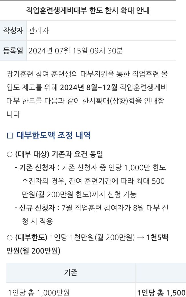 이 공지에 따르면, 신규 신청자는 7월에 직업훈련에 참여한 경우 8월에 대부 신청을 할 수 있습니다. 이는 8월에 훈련을 받는 사람이 아닌 7월에 이미 훈련에 참여한 사람만 8월 대부 신청이 가능하다는 의미입니다. 8월에 훈련을 받는 사람은 다음 달에 해당 조건에 따라 대부를 신청할 수 있을 것으로 보입니다.