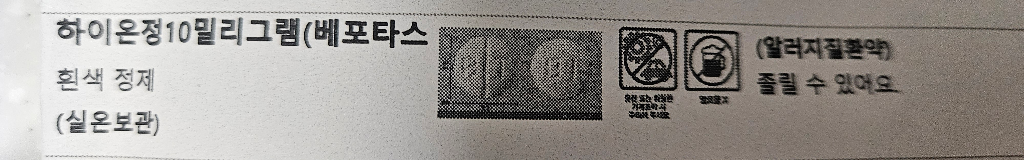 문의줏신 사진의 하이온정은 항히스타민제로 두드러기 증상이 있는 경우 복용해도 되며, 지르텍보다 졸음 부작용이 덜합니다.