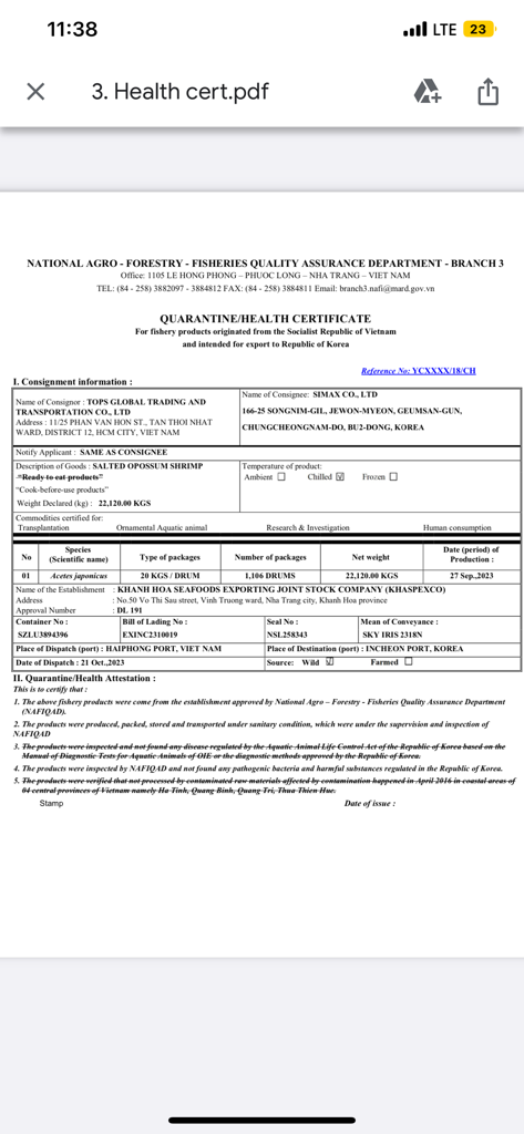 새우를 한국으로 수입하려면 한국에서 수입신고 전에 수산물 검역과 식품검역을 받아야 하며, 수산물 검역을 받기 위해서는 수출국에서 발행된 검역증 원본이 필요합니다. 또한, 물품의 상태를 표시하여야 하므로 냉동상태라면 Frozen등의 표시를 하여야 합니다.