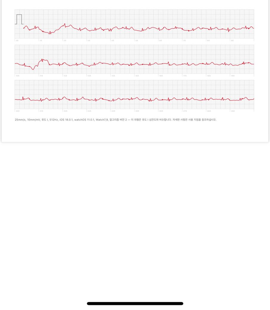 현재 심전도의 파형으로 미루어볼 때 적절한 측정이 제대로 되지 않은 것으로 생각됩니다. 일단 기본 축이 일자로 형성되어 있지 않고 위아래로 움직이면서 측정된 것으로 보아 안정상태에서 촬영하지 않았을 가능성이 있으며 이외에도 기계적인 문제로 인해 파형이 제대로 입력이 안된 상태의 심전도일 가능성이 높습니다.