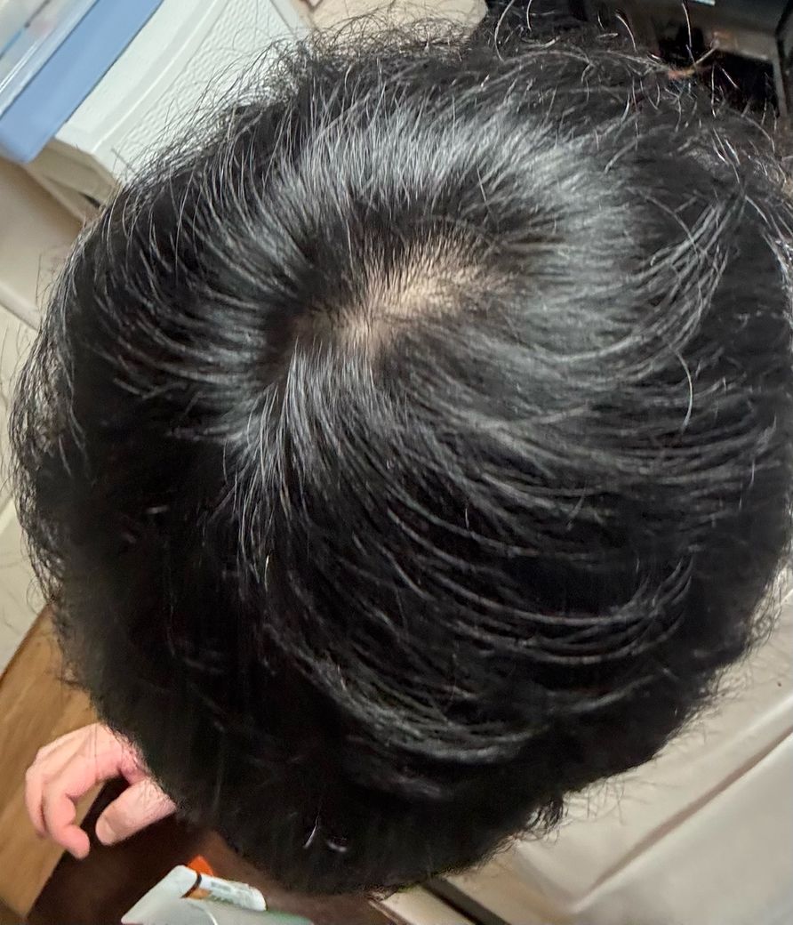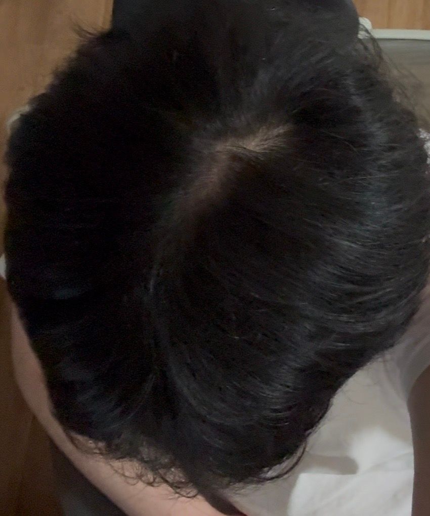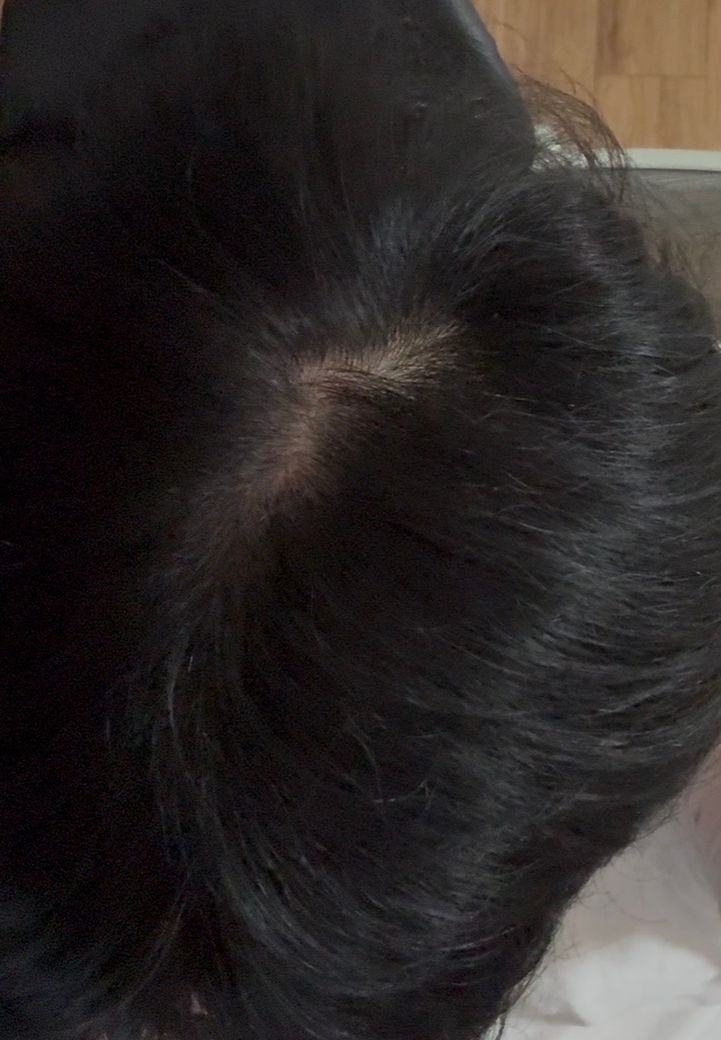 사진상 정수리 중심에 두피가 원형으로 보이는 부분이 있으나, 전형적인 정수리 탈모 소견으로 단정하기는 어렵습니다. 정수리는 모발이 방사형으로 갈라지는 ‘가마’ 부위라 정상적으로도 두피가 비교적 잘 보일 수 있습니다. 특히 모발이 굵고 주변 숱이 많은 경우 중앙 가마 부위만 상대적으로 비어 보이는 경우가 흔합니다.